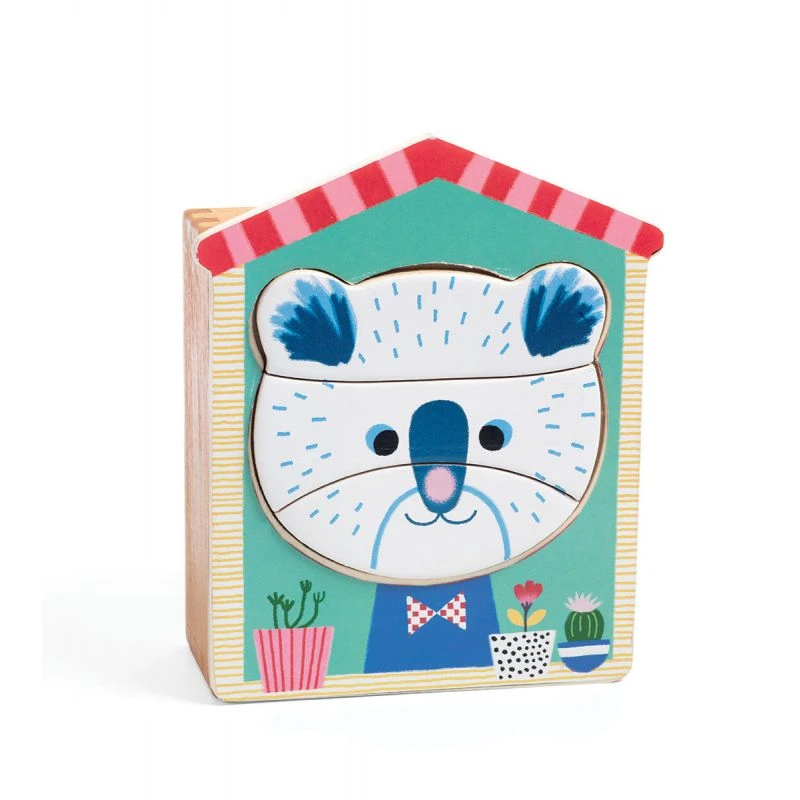 Face mix un un coffret en bois contenant 6 petits puzzles de 3 pièces représentant des visages d’animaux. L’enfant pourra s’amuser à les reconstituer ou à les mélanger pour créer des animaux rigolos. Une fois le jeu terminé, toutes les pièces peuvent être rangées dans le coffret.