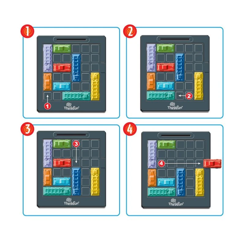 Voici par exemple un défi simple à réaliser. Après avoir placé les voitures en suivant le schéma de la carte, il faut (1) monter la voiture orange, (2) décaler vers la gauche le bus vert, (3) faire descendre le bus bleu et enfin (4) faire sortir la voiture rouge.