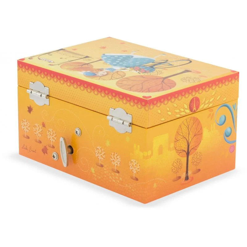 Sur le thème de Paris en automne, cette belle boîte à bijoux musicale accompagnera votre petite fille sur l’air de « A bicyclette » d’Etienne Lorin. Lors de l’ouverture de la boîte à bijoux, la petite danseuse se mettra à danser au son de la mélodie. Le mécanisme manuelle (ne nécessitant donc pas de piles) se trouve au dos de la boîte.