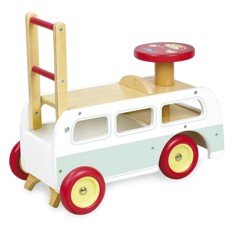 Ce combi rétro ne laissera personne indifférent. A la fois chariot de marche et porteur avec un look délicieusement rétro qui reprend les lignes du fameux combi Volkswagen cette réalisation de Vilac va faire plaisir aux amoureux des objets design. Il comblera également bébé qui pourra se promener sur ce porteur Vilac et emporter avec lui ses doudous en les mettant dans le coffre du combi.