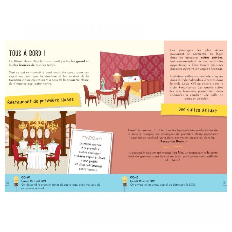 Avec ce livre jeu édité par Sassi, les enfants apprendront toute l’histoire passionnante et tragique du Titanic, de sa construction dans les chantiers navals de Belfast jusqu’à son épave aujourd’hui. Comment s’organisait la vie à l’intérieur de ce géant des mers, qui étaient les passagers, comment eu lieu le naufrage, quelle est l’histoire du navire Carpathia venu à leur secours …