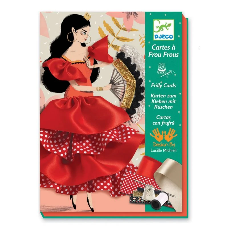 Flamenco de Djeco est un coffret d’initiation à la couture à l’aide de cartes pré-perforées permettant de faciliter le passage de l’aiguille. Il est livré avec des tissus, rubans et dentelles pour créer des vêtements à la manière des stylistes.