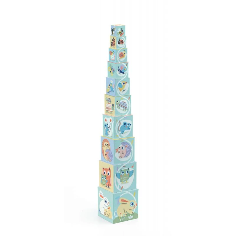 BabyBloki est un jeu de cubes à empiler de la collection Baby blanc de Djeco. Cette collection est caractérisée par des couleurs pastel très douces et des illustrations adaptées aux jeunes enfants dès 12 mois. Cet ensemble de 10 cubes à emboîter ou superposer permettra à bébé d’exercer sa dextérité et sa logique. Les cubes présentent sur 4 de leurs faces des illustrations que l’enfant pourra coordonner. Sur une face, les cubes sont numérotés de 1 à 10 du plus petit au plus grand avec des petits dessins répétés autant de fois que le chiffre indiqué et qui permettront aux enfants une première approche des chiffres.