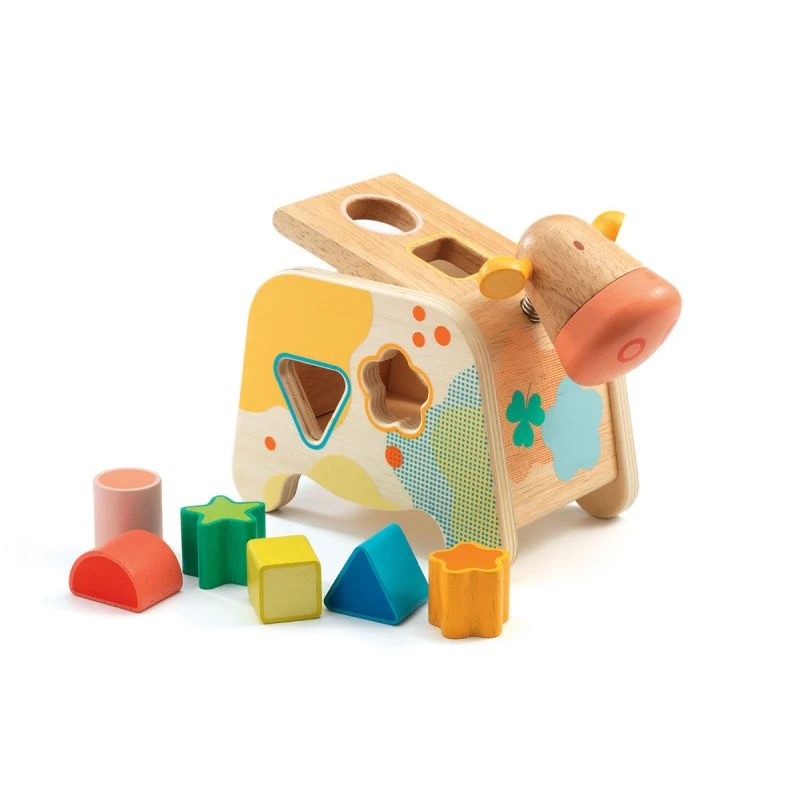 Djeco revisite ce jeu indémodable qu’est la boite à forme et nous livre une jolie vache aux couleurs douces avec une tête perchée sur un ressort.