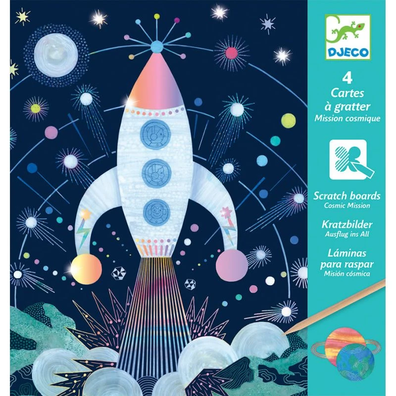 Mission cosmique de Djeco est un ensemble de 4 cartes à gratter qui vous invite à la découverte de l’espace.