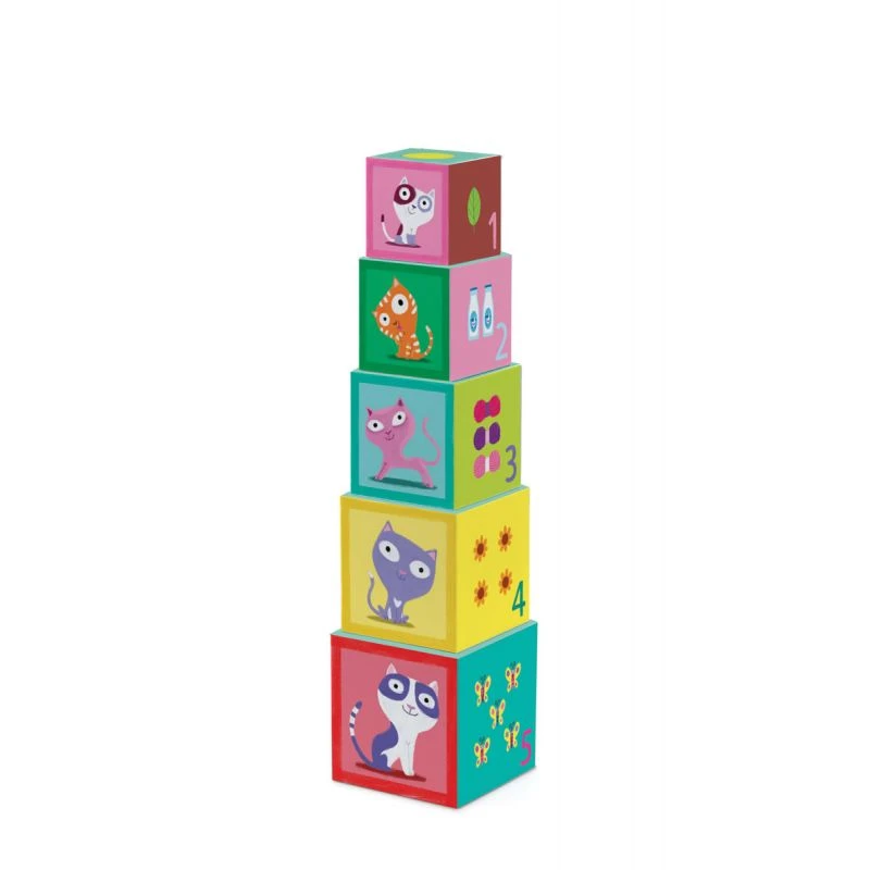 Catibloc de la marque Djeco est un petit jeu de 5 cubes à empiler pour les enfants dès 18 mois. Une sympathique petite figurine de chat en plastique souple accompagne les cubes et permettra à bébé de jouer avec pour le faire grimper sur la tour ou le faire sauter de cube en cube. Pour construire la tour parfaite, l’enfant devra faire coïncider les faces des cubes. Mais le plus amusant dans un premier temps sera bien sûr de démolir la tour !
