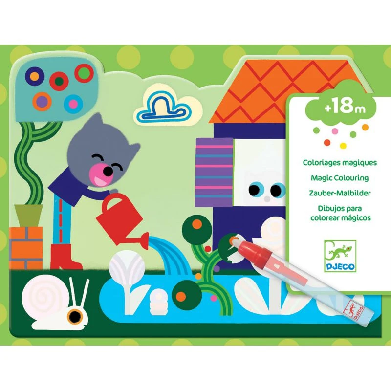 Caché dans le jardin est un coffret de coloriage à l’eau qui comprend 4 grandes scènes que l’enfant va pouvoir colorier à l’aide du crayon à eau. Il fera ainsi apparaître les images comme par magie. Une fois sec, le dessin disparaît de nouveau et l’enfant peut recommencer autant de fois qu’il le souhaite.