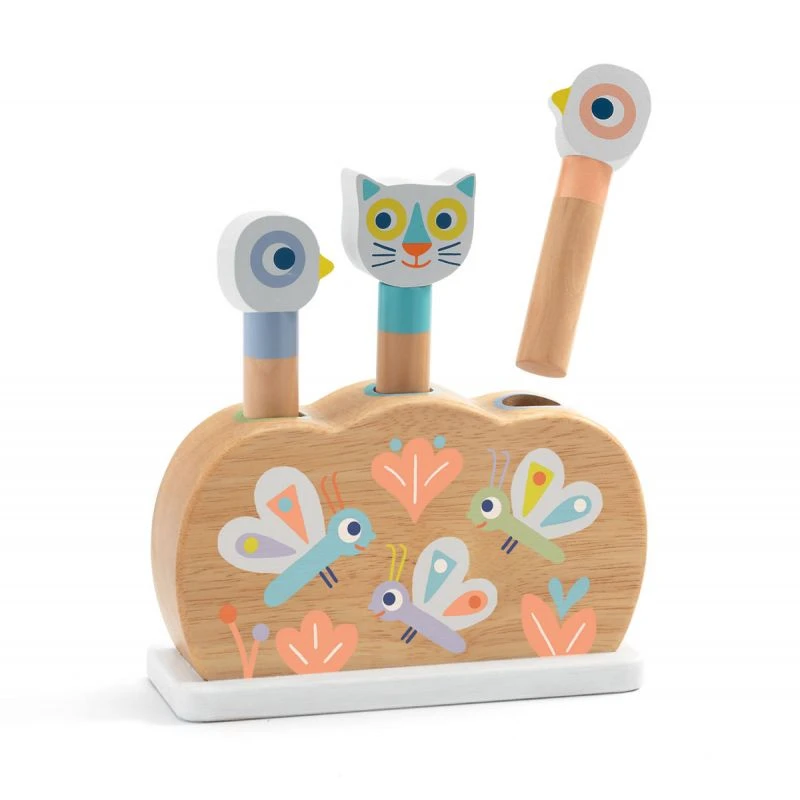 Djeco vous présente BabyPopi un jeu de popup à ressort de la collection Baby Blanc dans laquelle le bois brut est mis en valeur.