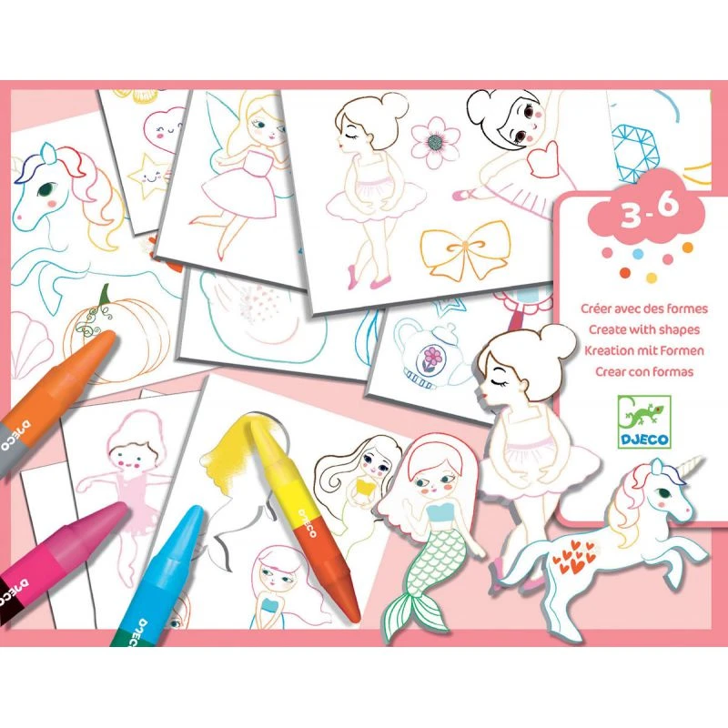 Dans sa nouvelle collection de loisirs créatifs « Un monde à créer » Djeco vous présente son coffret « filles », spécialement conçu pour les jeunes filles de 3 à 6 ans. Il comprenant des pochoirs et des formes à colorier et à coller sur de grandes feuilles A3. Un monde à créer filles, propose de créer 4 grandes scènes sur des feuilles de taille A3 dans des thématiques et des coloris très girly : des danseuses, des princesses, des fées, des licornes, des sirènes, … Dans un premier temps les petites filles devront colorier les formes prédécoupées sur les 10 planches fournies. Il suffira ensuite de les détacher du support et de les coller sur une grande feuille et enfin décorer avec les pochoirs.
