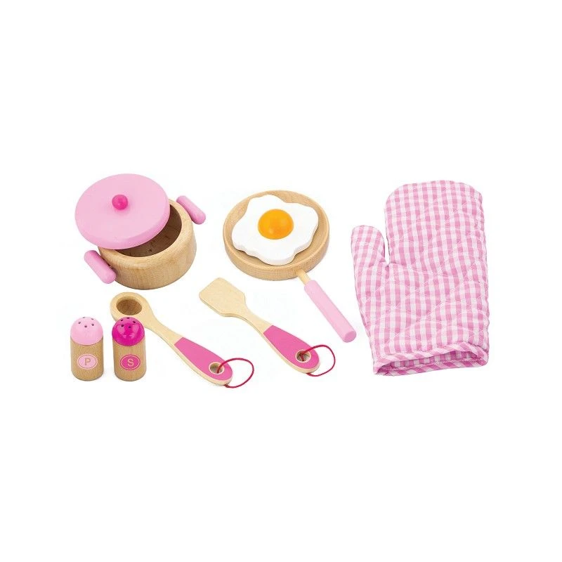 Voici un ensemble de dînette contenant tout le nécessaire pour se lancer dans la cuisine. Il contient un faitout avec son couvercle et deux cuillères ainsi qu’une poële, un œuf au plat et une manique pour ne surtout pas se brûler. Une salière et une poivrière accompagnent l’ensemble car il n’est pas question de servir un œuf fadasse !