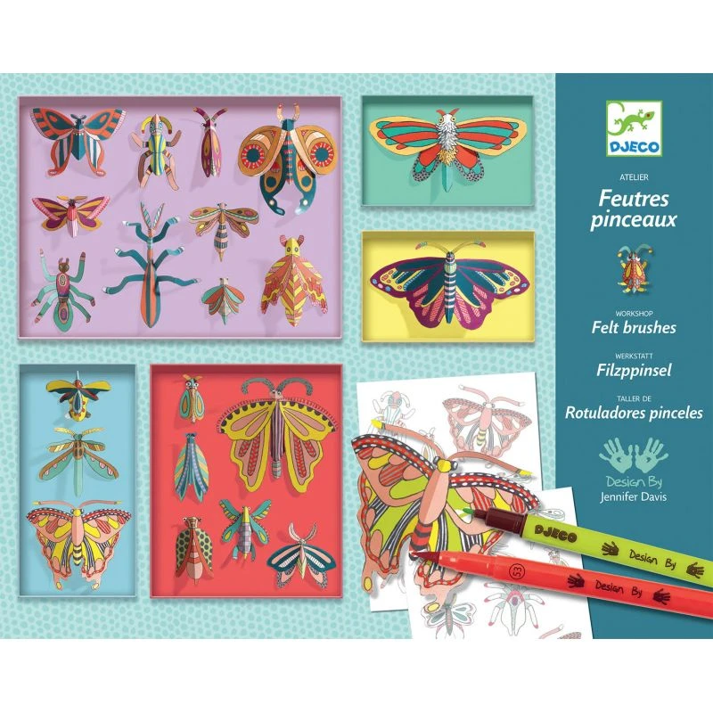 En reprenant le principe des cabinets de curiosités ou étaient rassemblées les choses rares venant d’un monde lointain, Djeco a créer un atelier de feutres pinceaux consistant à colorier des insectes et ensuite les mettre en valeur dans des cadres colorés.
