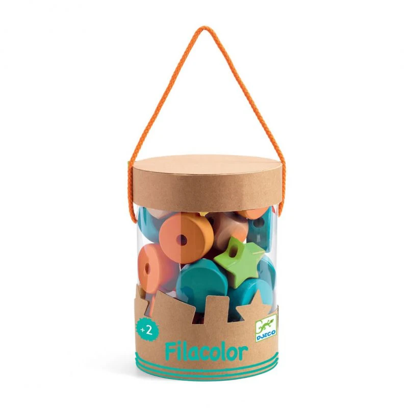 Filacolor est un jeu de grosses perles à enfiler en bois brut et aux couleurs douces. Tout en réalisant de jolis colliers de perles, l’enfant exercera sa dextérité. Il pourra associer les formes, les couleurs ou encore créer des séquences en les alternant. Les grosses perles seront bien adaptées à des petites mains d’un enfant de 2 ans.