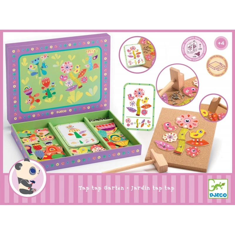 Les enfants vont adorer créer des fleurs multicolores avec ce jeu de formes à clouer. Tap tap jardin est un coffret contenant des pièces de bois pré trouées un marteau et une planche de liège.