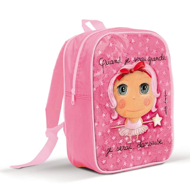 Un sac à dos rose avec des bretelles matelassées et réglables décorée par l’artiste Isabelle Kessedjian avec son personnage de la danseuse.