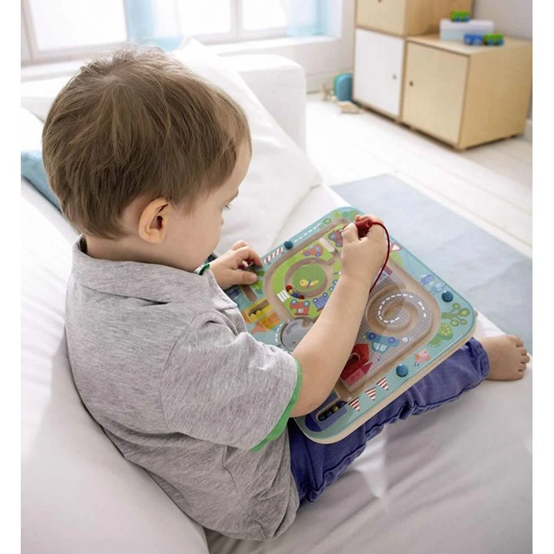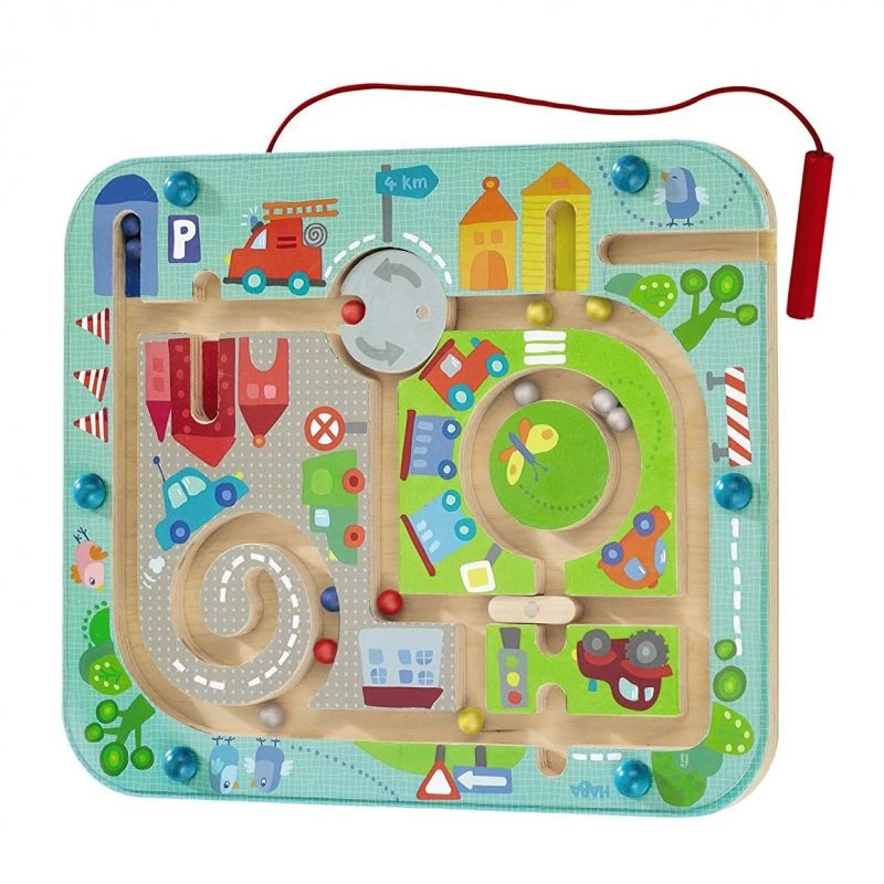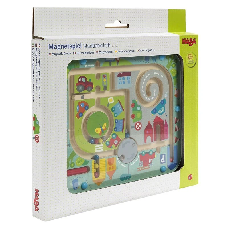 Dans le jeu magnétique ville Labyrinthe, les agents de police en herbe ont de quoi faire : avec la baguette magnétique ils peuvent emmener les billes sur les parkings de couleur correspondante, déplacer le disque tournant, régler la circulation au rond-point en bloquant une rue avec le bloc coulissant ou déplacer les billes comme il leur plaira.