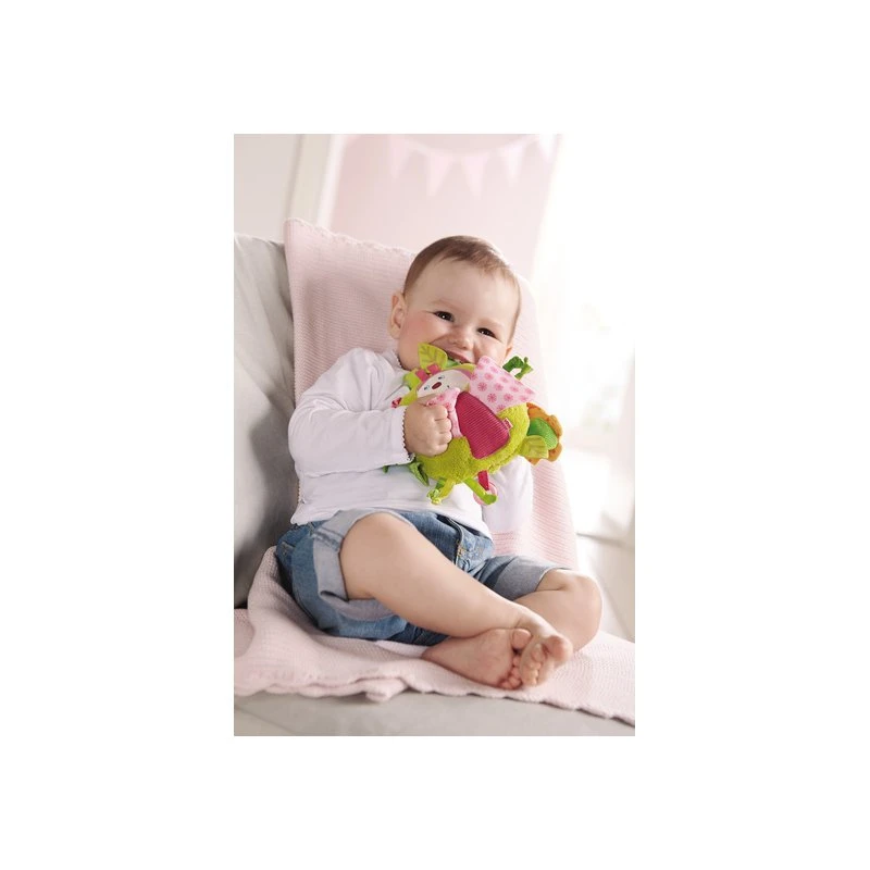 Ce jouet comporte également des éléments de dentition ainsi qu’une attache autoagrippante pour fixer à la poussette, au transat ou aux barreaux d’un lit.