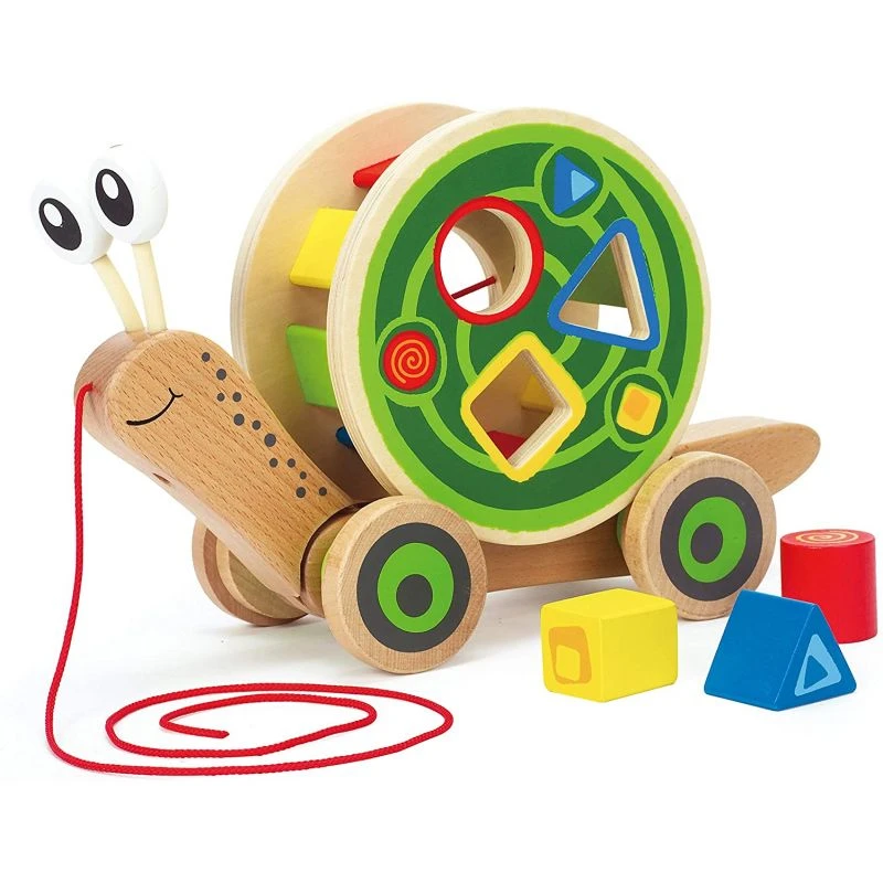 Cet escargot multifonctions Hape porte une coquille remplie de blocs de bois. Allégez l’escargot en enlevant la roue avec les formes colorées, et il pourra rouler tout seul.