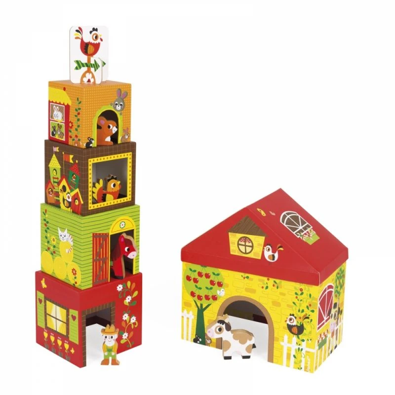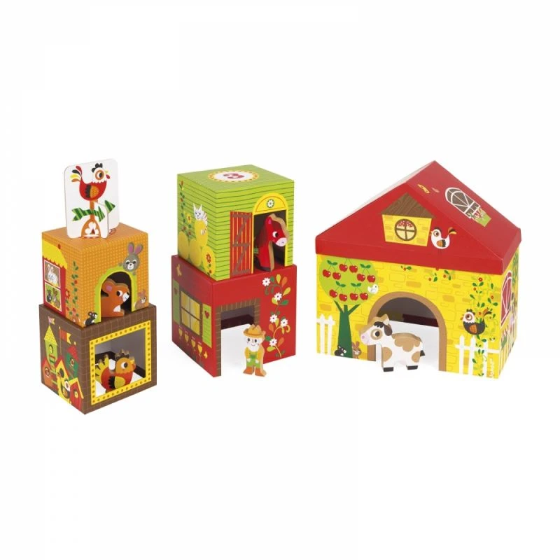 Multikub Ferme contient 5 personnages en bois : une vache, un cheval, une poule, un lapin et un fermier, 5 cubes en carton à empiler ainsi qu’une girouette à placer au sommet.