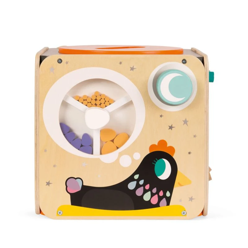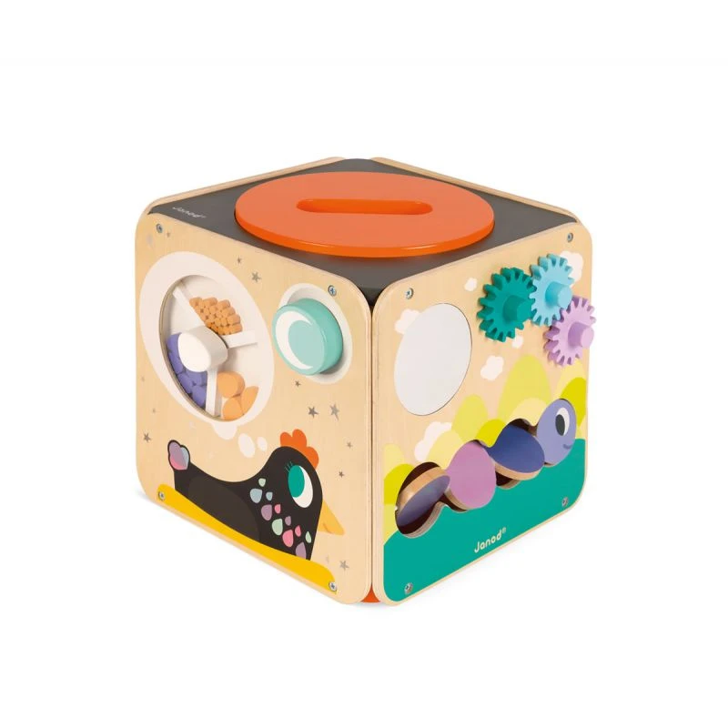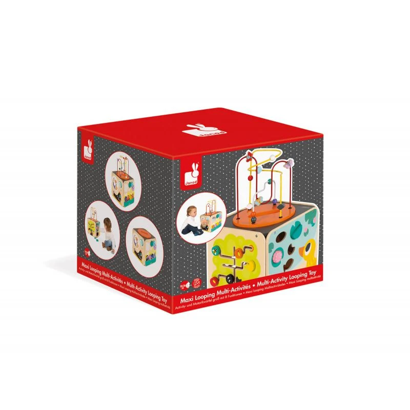 Maxi looping est un cube d’activités en bois avec 8 activités. Bébé découvrira