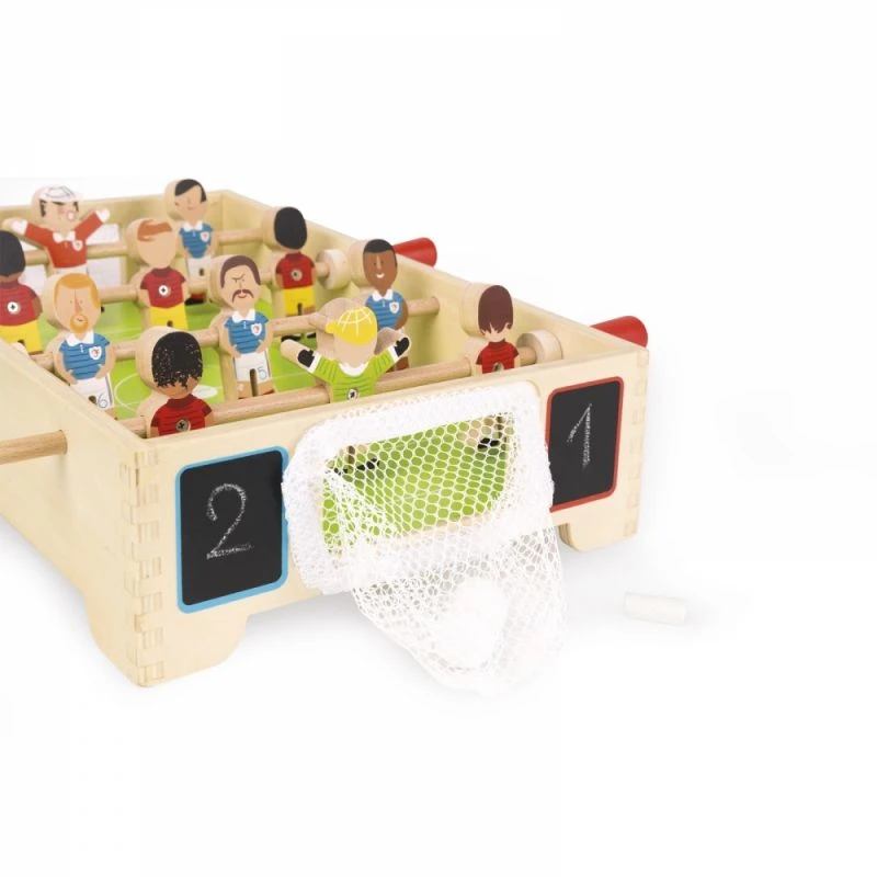 Le babyfoot Janod est composé de 2 x 6 joueurs en bois massif. Il est fourni avec 3 billes également en bois. Les filets des buts sont attachés à l’aide de velcros et peuvent ainsi être facilement enlevés afin de récupérer les balles.
