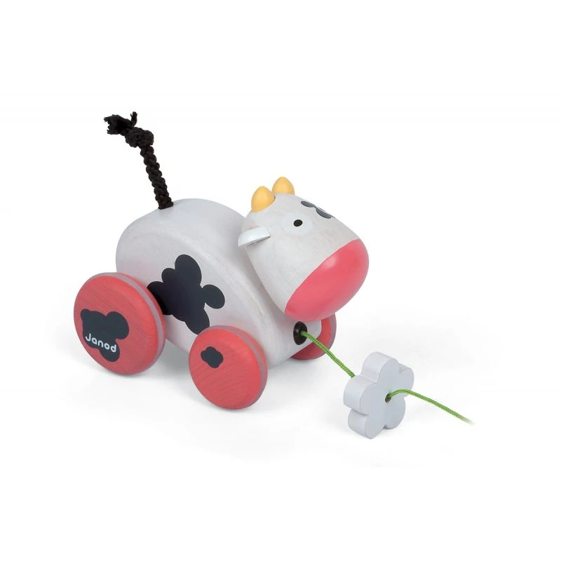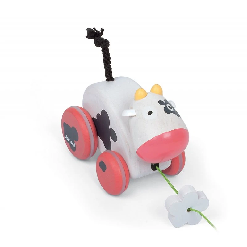 Une sympathique vache en bois massif qui accompagnera votre enfant lors de ses premiers pas et des ses premières balades en se dandinant et en faisant tinter sa clochette (intégrée à l’intérieur du corps). Les roues en bois sont cerclées de caoutchouc pour ne pas déraper et ne pas faire de bruit.