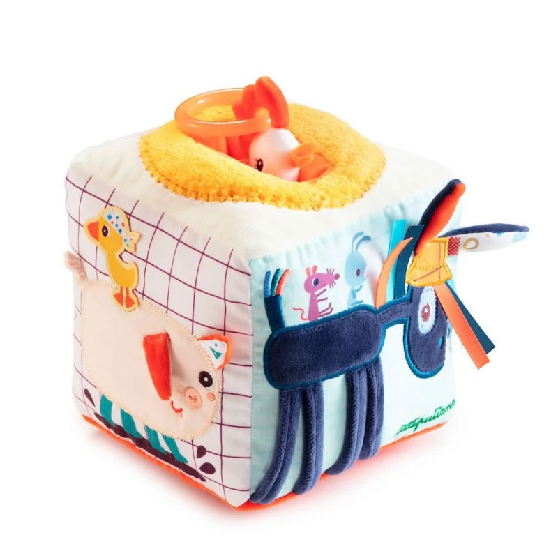 Ce cube d’activité Ferme de Lilliputiens a pour originalité d’être sonore. Lorsque les enfants secoueront ce cube des sons d’animaux se feront entendre. Les enfants qui adorent les animaux de la ferme seront ravis d’entendre le cochon, l’âne, le chat, le canard, …. Ils pourront jouer avec l’oreille ou la queue du cochon, caresser le mouton duveteux, jouer avec les étiquettes qui sortent du chapeau de l’âne, se regarder dans le miroir, tirer sur l’anneau de dentition pour découvrir le coq