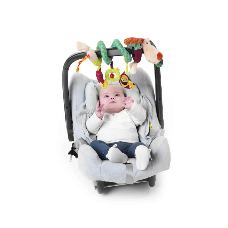 Accrochez la spirale d’acitivités Jef le chien ou vous voulez : la poussette, le cosy, les barreaux d’un lit, le parc, … Bébé pourra s’amuser avec le miroir hérisson, le hochet ou la clochette. Les couleurs, les formes, les textures, les bruits, tout est fait pour éveiller les sens de bébé qui prendra beaucoup de plaisir à jouer sous le regard coquin de Jef.