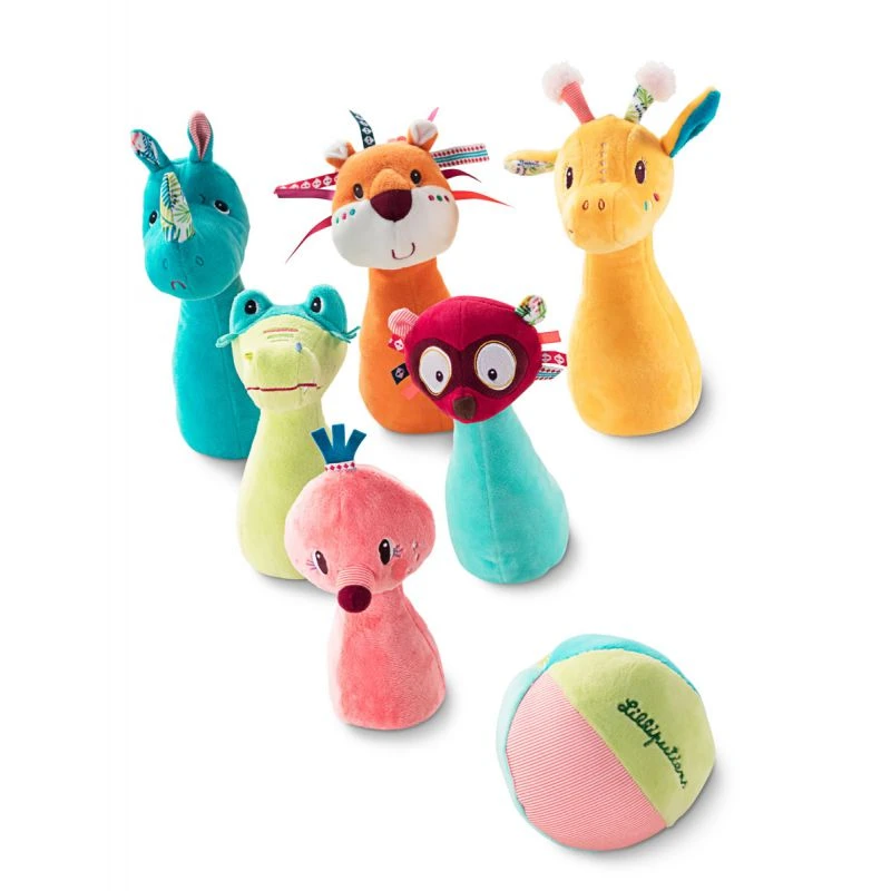Un jeu de quilles avec les animaux de la jungle de Lilliputiens que tous les petits adorent. Les animaux de la jungle, doux et colorés, sont les quilles et un petit hochet se cache dans la balle pour plus de stimulation sensorielle. Retrouvez Georges le lémurien, Jack le lion, Anaïs le flamant rose, Marius le rhinocéros, Anatole le crocodile et Zia la girafe dans ce jeu de quilles en tissu.