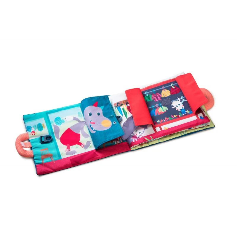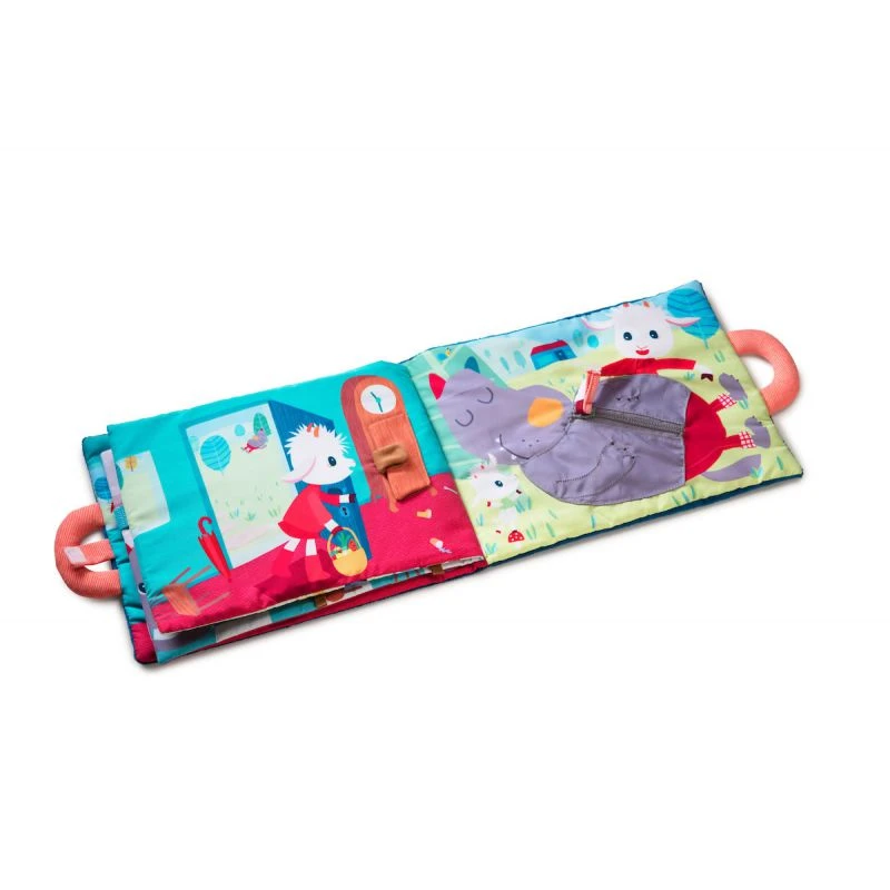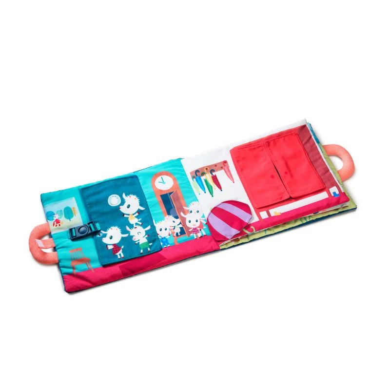 Le loup et les 7 chevreaux est un grand livre interactif en tissu dans lequel les enfants devront aider maman chèvre à retrouver tous ses petits chevreaux en ouvrant toutes les portes fermées avec différents systèmes de fermeture (bouton, clip, nœud avec des lacets, velcro, fermeture éclair).