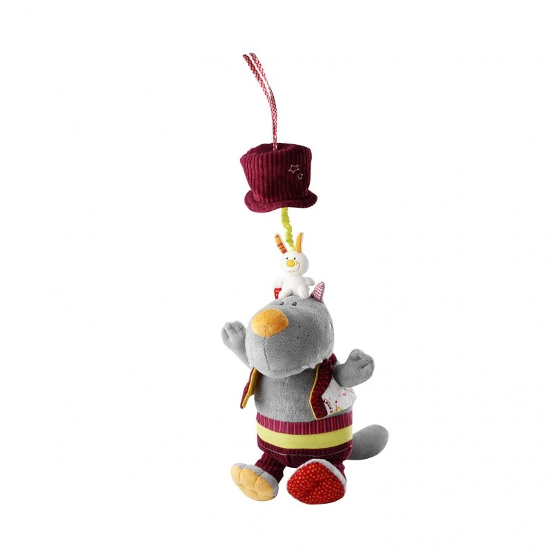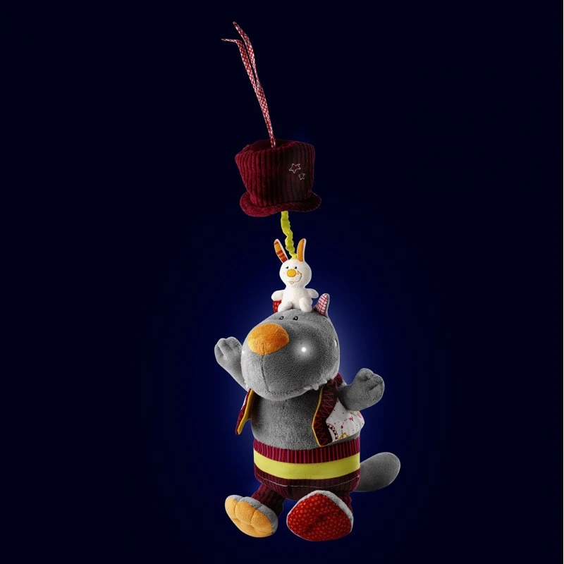 La peluche musicale Nicolas le loup accompagnera bébé lors du coucher. Cette peluche est pleine de surprises. Pour jouer la mélodie, il faudra tirer son chapeau ce qui aura aussi pour effet de faire clignoter ses babines. Et sous le chapeau se cache un petit lapin.