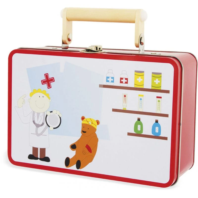 La mallette de docteur de la marque française Ulysse est une petite mallette pour les enfants dès 3 ans. Son contenu est très complet, elle contient aussi bien de quoi déguiser l’enfant avec une coiffe d’infirmière, que divers instruments en bois ou encore un feuillet d’ordonnance.
