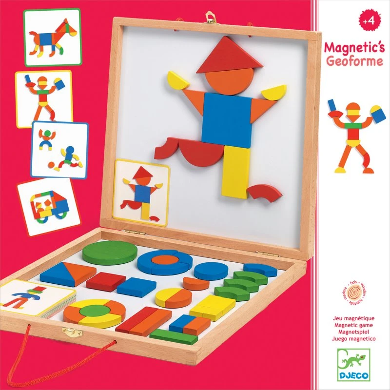 La mallette géoforme de Djeco contient 42 pièces de bois magnétiques représentant des formes géométrique simples ainsi que 24 exemples de figures à reproduire. L’enfant doit reproduire les formes proposées par les fiches en utilisant les différentes pièces.