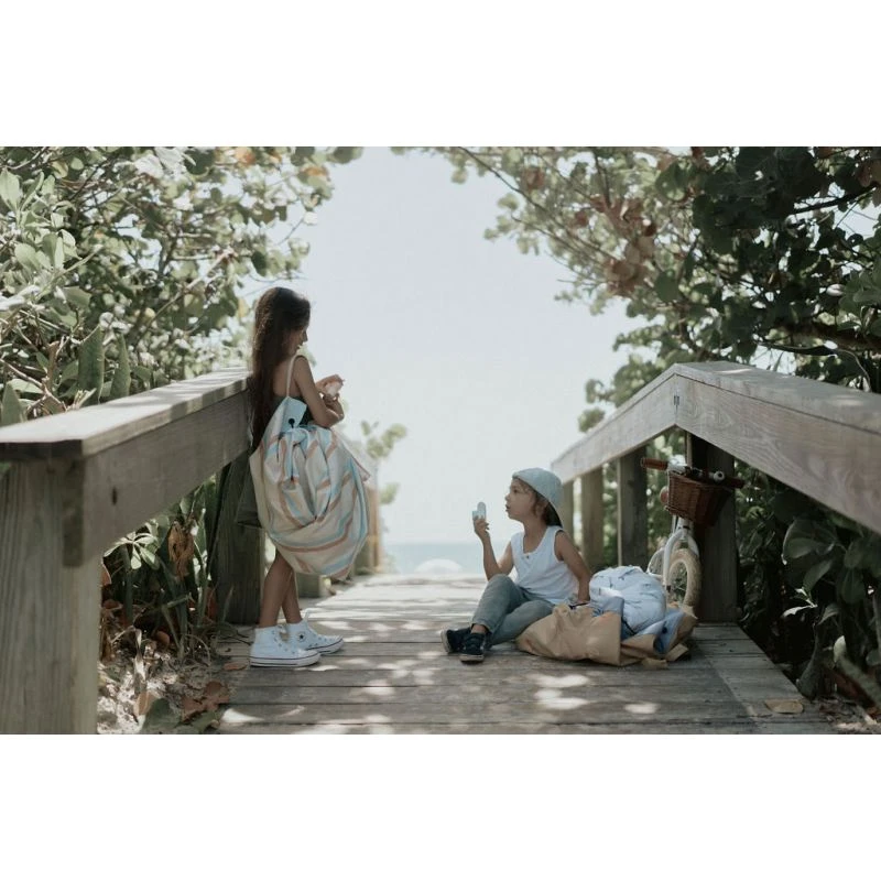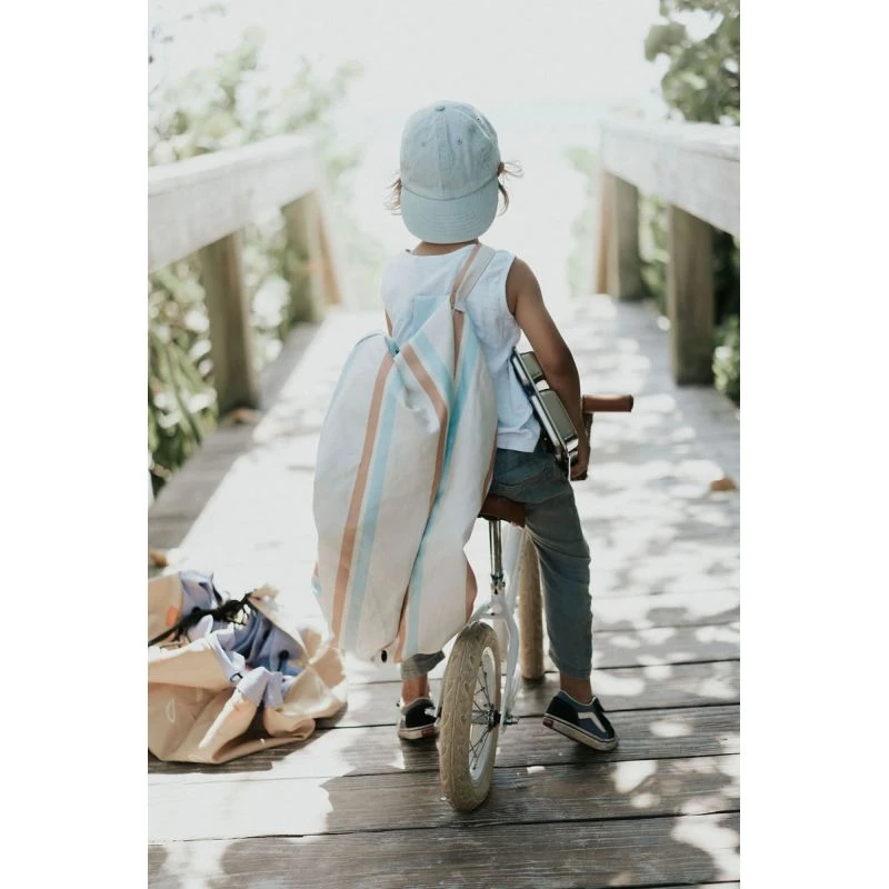 Stripes est élégant sac de rangement / tapis de jeu de la nouvelle gamme Outdoor de Play & Go. Ce sac aussi beau que résistant vous permettra d’emmener tout le nécessaire aussi bien à la piscine, qu’à la plage, à un pique nique ou encore simplement dans votre jardin. Une fois ouvert ce sac se transformera en natte imperméable de 140 cm de diamètre permettant à vos enfant de jouer au sec même sur un sol humide. A la plage, fini les corvées de nettoyage séchage des jouets. Repliez le sac en tirant simplement sur les liens coulissants et l’eau et les grains de sable s’évacuerons par le trou prévu à cet effet. Plié ce sac ne prend pas beaucoup de place et peut facilement être emporté en vacances.