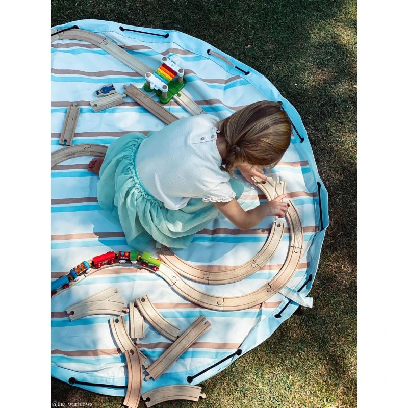 Ce tapis de jeu Stripes se transforme en un tour de main en sac de rangement à porter en bandoulière ou à la main grâce à sa poignée. Il est fabriqué en polyester et TPU (polyuréthanes thermoplastiques) ce qui le rend à la fois imperméable et résistant.