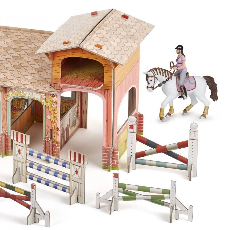 Le coffret poney Club de la marque Papo est un ensemble complet pour jouer au poney club. Il est composé d’une écurie en carton renforcé décorée avec de nombreux détails illustrant les équipements classique d’un poney club comme les box pour chevaux ainsi que des décorations naturelles. De nombreux obstacles variés également en carton sont fournis. Enfin vous trouverez dans ce coffret deux beaux chevaux et leurs cavalières en tenue d’équitation.