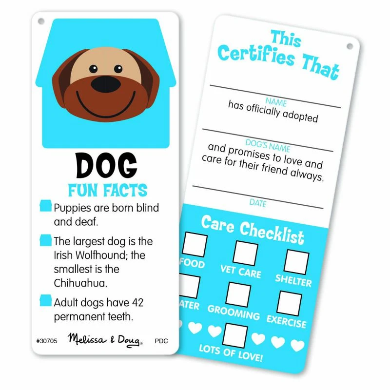 Ce chien câlin est livré avec un collier cousu, un badge à personnaliser, une liste de suivi des soins, un certificat d’adoption et une carte d’informations amusantes sur les chiens (en anglais).