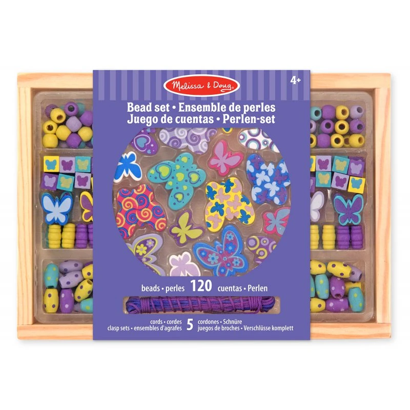 Joli coffret en bois de perles à enfiler de couleurs assorties et de différentes tailles et formes sur le thème des papillons. Le coffret contient 120 perles et 5 lacets de couleur.