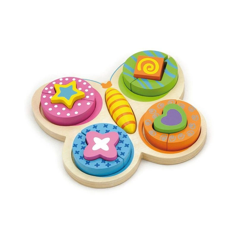 Ce sympathique papillon très coloré est un puzzle en relief composé de grosses pièces en bois à encastrer.
