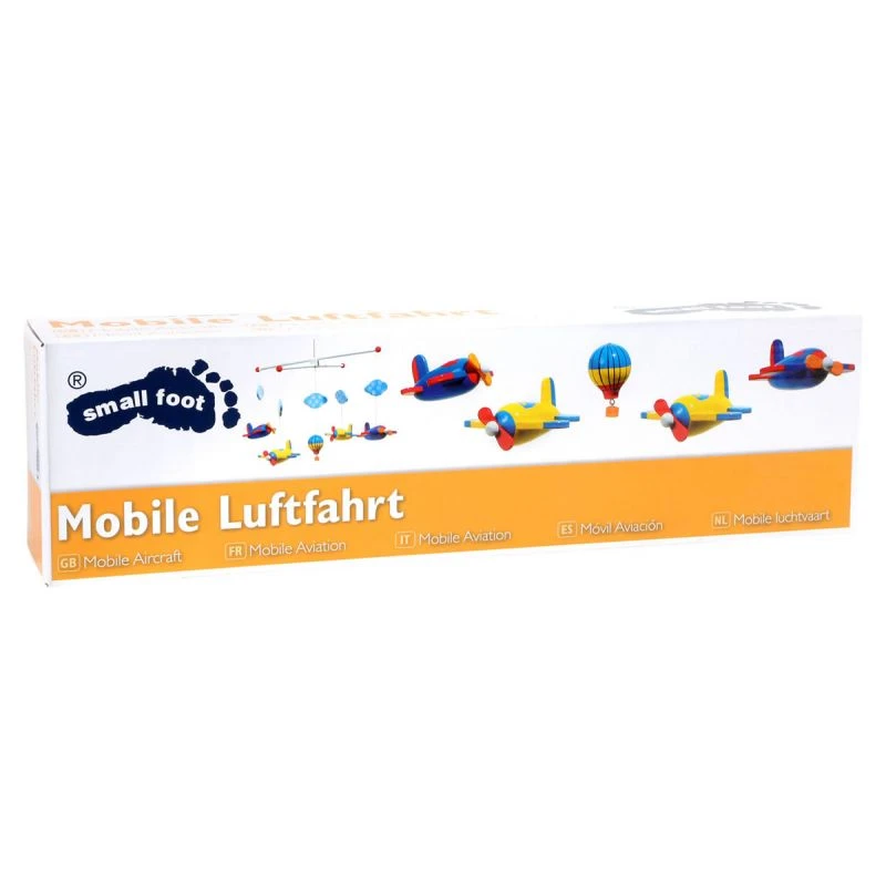 Ce mobile en bois très coloré propose un spectacle d’avions et montgolfière dans les nuages.