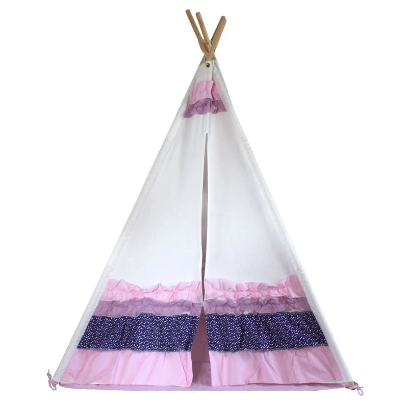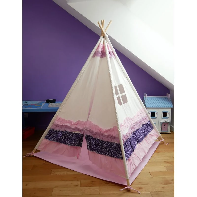 Ce tipi est très original et ne laissera pas indifférent. Les volants roses et violets cousus sur ses flans lui donnent un aspect unique. Les contrastes de couleur et de matière en font un bel objet de décoration dont les petites filles seront extrêmement fières. Grand et robuste ce tipi à froufous accompagnera votre fille de longues années.