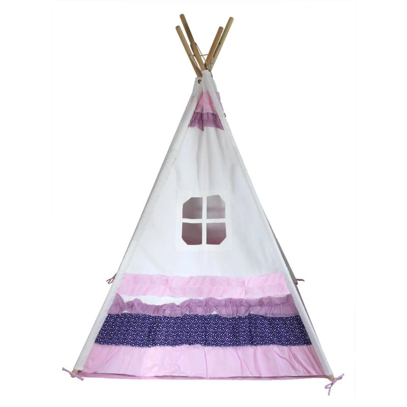 Comme tous les tipis ChildFun, ce tipi est constitué d’une toile épaisse 100% coton et de 4 montants solides en bois. Ce tipi est à la fois robuste et très facile à mettre en place et à ranger. Six rangées de volants roses, mauves et violets à points blancs sont cousus tout autour du tipi. Le tipi dispose d’une fenêtre à croisillons sur son flanc droit.