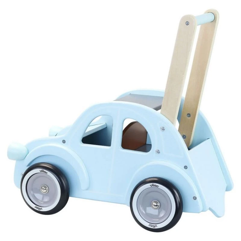 En partenariat avec la marque Citroën, Vilac a créé cette très jolie réplique de la Citroën 2CV sous la forme d’un chariot de marche. La couleur bleu clair offre un joli contraste avec la calandre noire frappée du logo Citroën et les roues cerclée de caoutchouc noir. Avec cette bouille indémodable ce chariot de marche sera parfait pour que bébé puisse effectuer ses premiers pas accompagné par ses doudous confortablement installés sur la banquette avant.