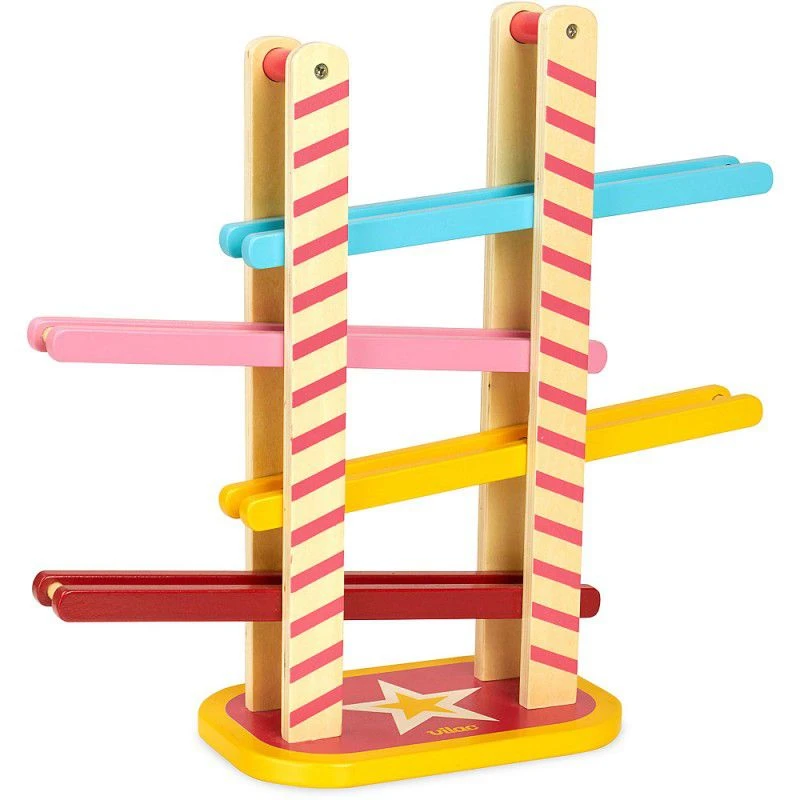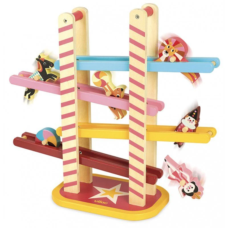 Vilac a eu la bonne idée de revisiter le classique toboggan à boules ou voitures avec cette jolie version inspirée du monde du cirque. En effet, la cascade des acrobates est un toboggan très coloré que vont dévaler les artistes et les animaux du cirque afin d’offrir un véritable spectacle aux jeunes enfants.