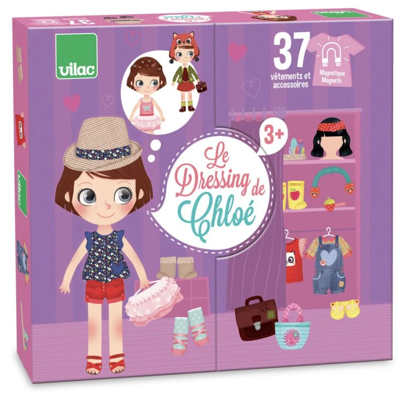 Comme beaucoup de petite fille Chloé est coquette et son dressing est bien garni. Comment va t elle s’habiller ce matin ? Quelle activité va t elle faire aujourd’hui ? A toi d’inventer la vie de Chloé et de l’habiller en conséquences à l’aide des 37 vêtements et accessoires magnétiques.